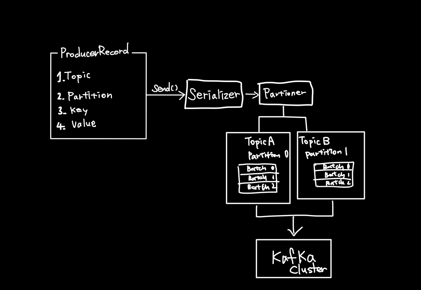 - 그 후 Partitioner에서 메시지를 어떤 파티션으로 보낼지 판단한다. 만약 ProducerRecord 객체를 만들 때 Partition과 Key를 지정했다면 생략된다.