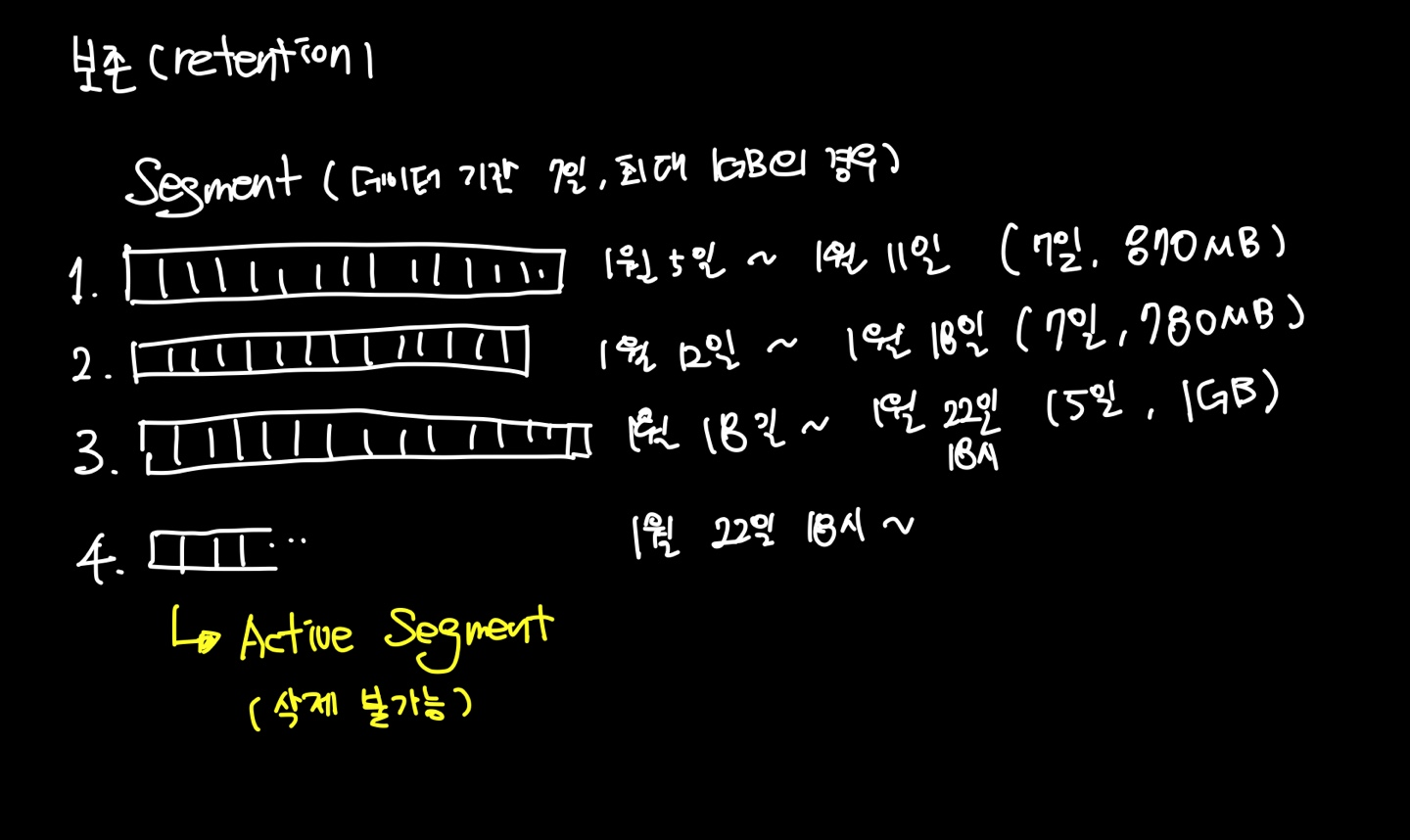 카프카는 데이터를 계속 보존하지 않고, 메시지큐이기 때문에 보존 기간을 설정해야 한다. 카프카에서는 파티션을 저장할 때 세그먼트 단위로 나누어서 저장한다. 세그먼트는 기간과 용량으로 설정할 수 있고 둘 중 하나가 만족된다면 새로운 세그먼트를 생성하여 쓴다. 쓰는 중인 세그먼트를 Active Segement라고 하는데 이것은 삭제가 불가능하다. 만약 로그 보관 기간을 1일로 두고 세그먼트 기간을 5일로 둔다면 5일동안 보존된다.