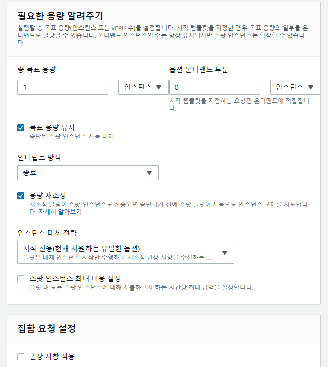 사용자가 지정한 기준을 바탕으로 시작되는 인스턴스 세트이다. 목표 용량을 정해두면 그 용량에 맞추어 인스턴스를 유지하려고 한다. 이 요청에 온디맨드 요청을 포함시킬 수 있다.