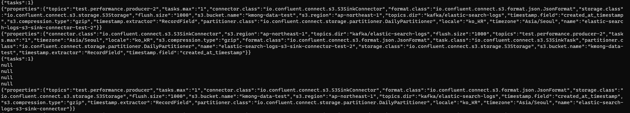 import json import requests headers = { 'Content-Type': 'application/json', 'Accept': 'application/json' } data = { "name": "your-connector-name", "config": { "topics": "your-topic-name", "tasks.max": 3, "connector.class": "io.confluent.connect.s3.S3SinkConnector", "format.class": "io.confluent.connect.s3.format.json.JsonFormat", "storage.class": "io.confluent.connect.s3.storage.S3Storage", "flush.size": 1000, "s3.bucket.name": "your-bucket-name", "s3.region": "ap-northeast-1", "topics.dir": "your-s3-dir", "s3.compression.type": "gzip", "locale": "ko_KR", "timezone": "Asia/Seoul" } } response = requests.post(f'http://localhost:8083/connectors', json.dumps(data, ensure_ascii=False), headers=headers) - 입력한 토픽에 프로듀서로 메세지를 보내면 flush.size인 1000개마다 S3에 저장하는 것을 확인할 수 있다.