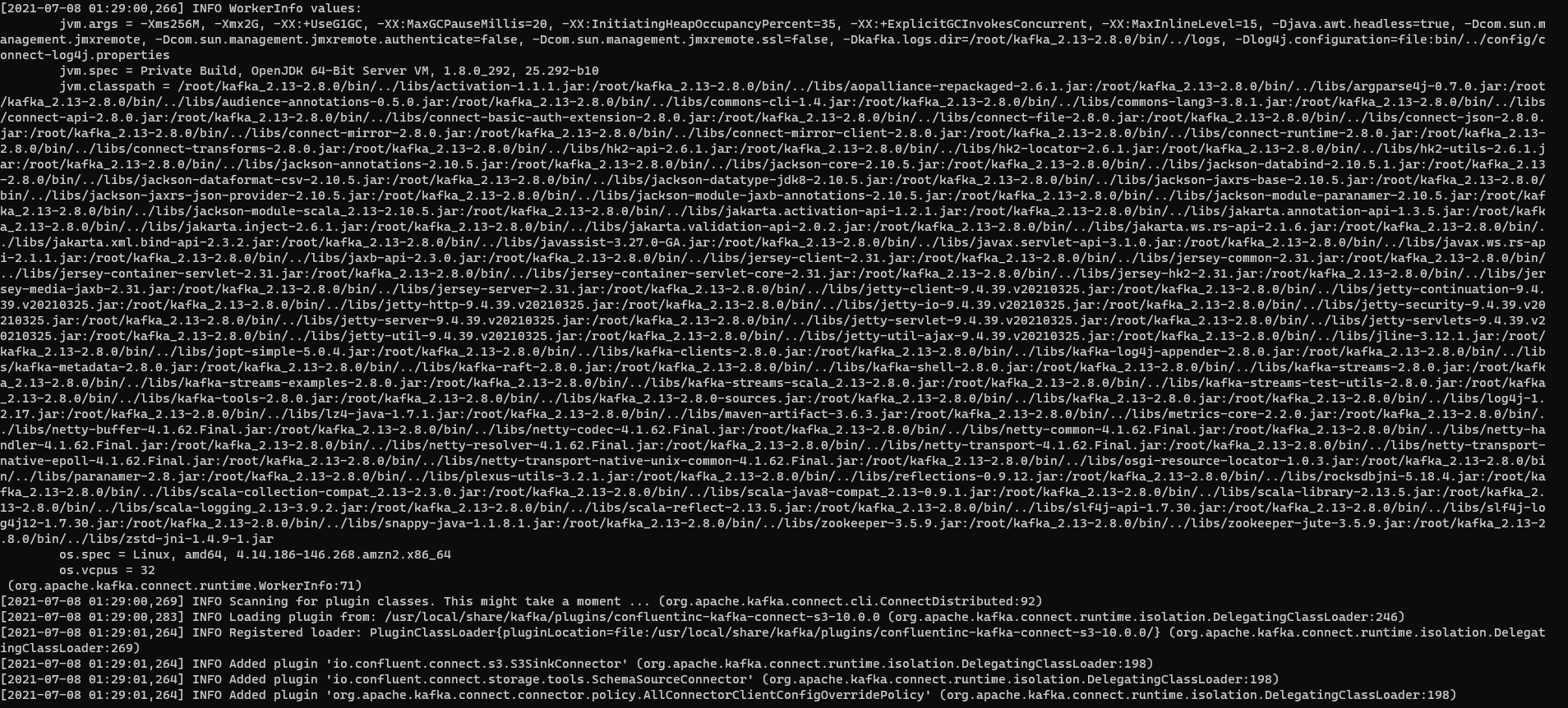curl -XGET http://localhost:8083 {"version":"2.8.0","commit":"ebb1d6e21c92130","kafka_cluster_id":"yRPN8K4URxyAr7kjiAAzA"} curl -XGET http://localhost:8083/connector-plugins [{"class":"io.confluent.connect.s3.S3SinkConnector","type":"sink","version":"10.0.0"},{"class":"io.confluent.connect.storage.tools.SchemaSourceConnector","type":"source","version":"2.8.0"},{"class":"org.apache.kafka.connect.file.FileStreamSinkConnector","type":"sink","version":"2.8.0"},{"class":"org.apache.kafka.connect.file.FileStreamSourceConnector","type":"source","version":"2.8.0"},{"class":"org.apache.kafka.connect.mirror.MirrorCheckpointConnector","type":"source","version":"1"},{"class":"org.apache.kafka.connect.mirror.MirrorHeartbeatConnector","type":"source","version":"1"},{"class":"org.apache.kafka.connect.mirror.MirrorSourceConnector","type":"source","version":"1"}]