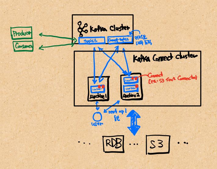 카프카로 데이터를 이동시킬 때 Kafka Connect를 사용하면 쉽고 편하게 이동시키는데에 도움이 된다. 예를 들면 MySQL에서 Kafka를 거쳐 S3에 넣고 싶을 때 JDBC Source Connector를 사용하여 MySQL에서 Kafka에 넣고, Kafka에서 S3 Sink Connector를 사용하여 S3에 넣을 수 있다. 여기에서 source connector는 데이터 소스에서 카프카로 데이터를 넣는 커넥터이고, sink connector는 데이터를 카프카에서 목적지로 데이터를 이동하는 커넥터이다.