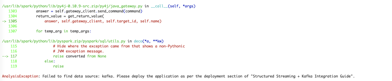 AnalysisException: Failed to find data source: kafka. Please deploy the application as per the deployment section of "Structured Streaming + Kafka Integration Guide".
