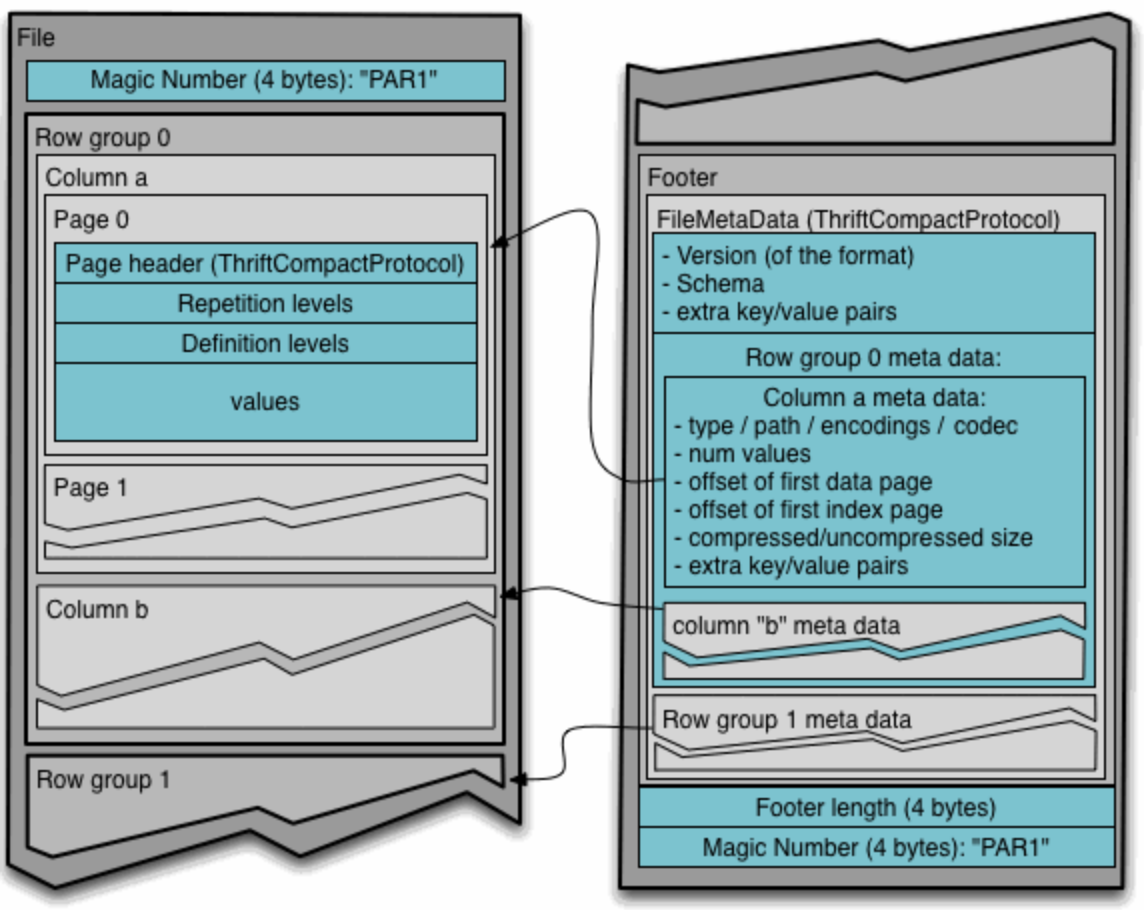 parquet format은 메타데이터와 데이터를 분리하도록 명시적으로 디자인되었습니다. 이를 통해 컬럼별로 여러 파일로 분류할 수 있으며, 단일 메타데이터 파일에서 여러 parquet file을 참조할 수도 있습니다.