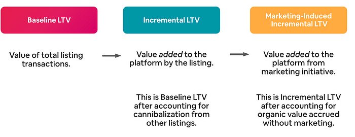 Airbnb의 LTV 프레임워크는 세 가지 주요 요소로 구성됩니다: - 기본 LTV: 특정 숙소가 향후 365일 동안 Airbnb에서 얼마나 많은 예약을 받을 것으로 예상되는지를 측정합니다. 이 과정에서 기계 학습을 활용하여 각 숙소에 대한 데이터를 분석합니다. - 증분 LTV: 새로운 숙소가 기존 숙소의 예약을 잠식(cannibalization)하는 것도 고려하여, 새로운 숙소가 추가한 가치를 측정하는 방식입니다. 증분 LTV는 기본 LTV에서 자신의 예약이 줄어드는 양을 빼는 방법으로 도출됩니다. - 마케팅 유도 증분 LTV: 마케팅 캠페인 등의 내부 이니셔티브로 인해 생성된 추가 가치를 측정합니다. 예를 들어, 호스트에게 무엇을 개선해야 하는지에 대한 정보 제공을 통해 예약이 증가한다면, 이 증가분을 측정합니다.
